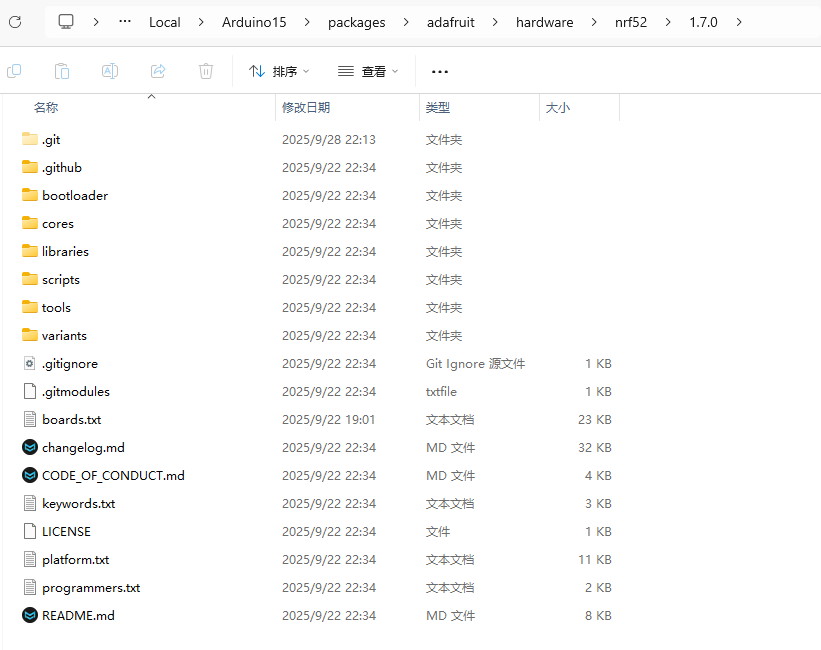 然后将这个文件夹中的内容全部删除,使用git克隆我这个已经修改好的仓库https://github.com/1wpc/Adafruit_nRF52_Arduino_ANT.git ,并放进1.7.0文件夹中,最终的目录结应该长这样。(ANT+网络密钥我已经配置好了)