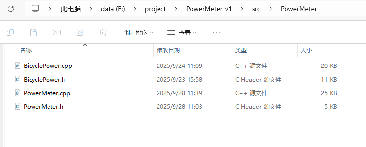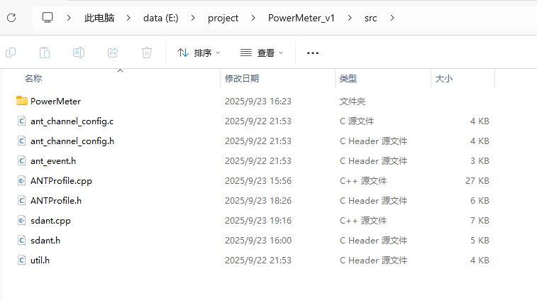 之后将刚才克隆的SDAntplus仓库下的src目录中的所有.h和.cpp文件复制到自己项目中的src文件夹下(不要管profiles文件夹),然后在src目录下新建一个名为PowerMeter的目录,然后将PowerMeter的profile文件放进去(这个几个文件可以从我的仓库中找,也就是BicyclePower和PowerMeterGitHub - 1wpc/PowerMeter_Arduino: XDSHacker function: XDS -> nrf52840 -> magene)。顺便说一下,SDAntplus仓库里的profile文件夹中就是一些常用的ANT+设备的profile实现。
