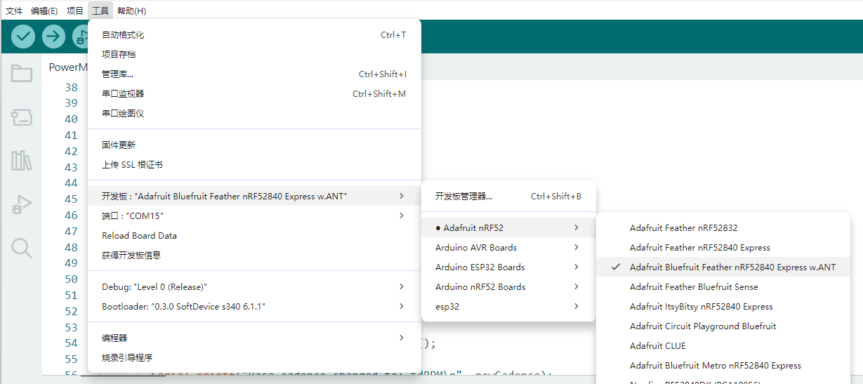 注意在ArduinoIDE中选择名称为Adafruit Bluefruit Feather nRF52840 Express w.ANT的开发板,然后正常运行就可以。